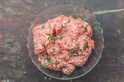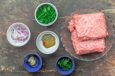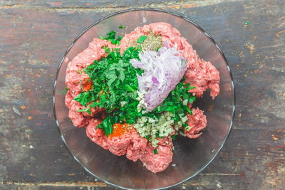 In a large bowl, place the meat. Add the grated / chopped onions, garlic, parsley, oregano, cumin and paprika. Salt and pepper to taste.