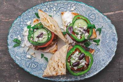 Cook for 30 minutes or until the internal temperature reaches 165 °F (74 °C). Turn halfway through. Top each burger with 1 tomato slices, 1 green bell pepper slice, 2 cucumber slices, homemade Tztaziki (see recipe) or commercial sauce, red onions slices, Kalamata olives slices and crumbled feta cheese to taste. Serve hot in pita or fancy buns.
