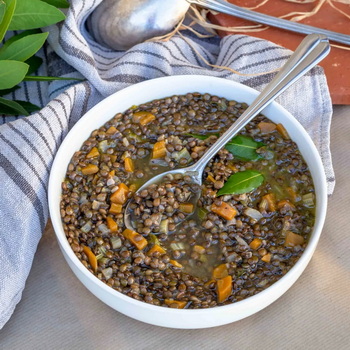 Finally, add the water and the mushrooms and mix well. Bring to a boil, then cook covered over medium heat for 45 minutes or until the lentils are tender. Mix occasionally.