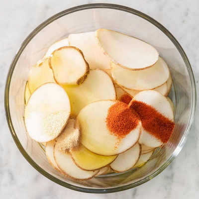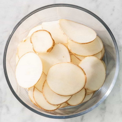 Thinly slice the potato chips and pat them dry. Use a mandolin for best results and evenly thick slices.