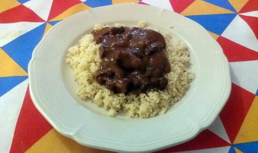 When serving, spread the rice on plates, make a shallow hole in the middle and add boiling kidney sauce. Serve immediately.